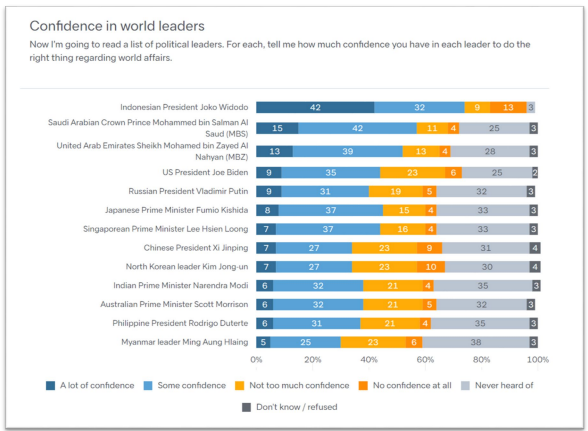 Although our survey was conducted in December 2021 (before the Ukraine invasion), it's interesting that Putin comes out somewhere in the middle in terms of overall confidence, ahead of Scott Morrison, Narendra Modi and Rodrigo Duterte. 6/