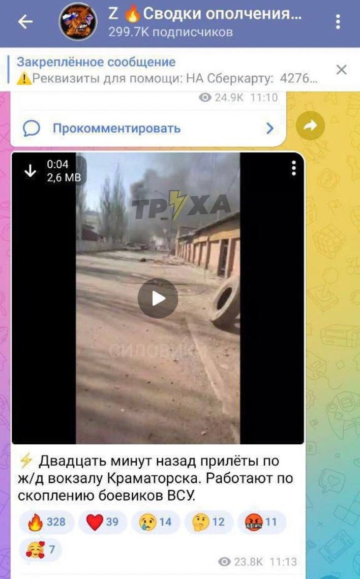 Local separatist publics half an hour after the hit began to publish information that russians hit at the "accumulation of #Ukraine troops in #Kramatorsk"