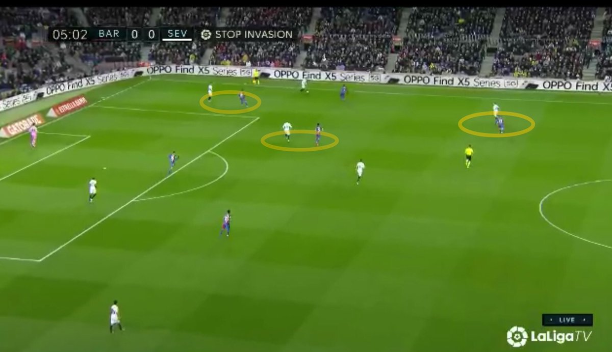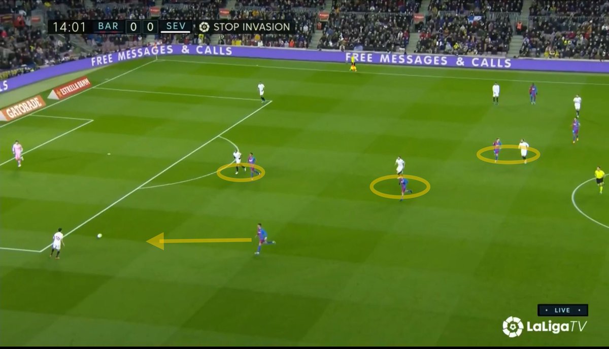 Like I said earlier, the whole shift of paradigm from FBs holding width to wingers holding width has implications to and from the defensive phase, and in this case allows for much better occupation of central regions to enable a passive pressing scheme such as this.