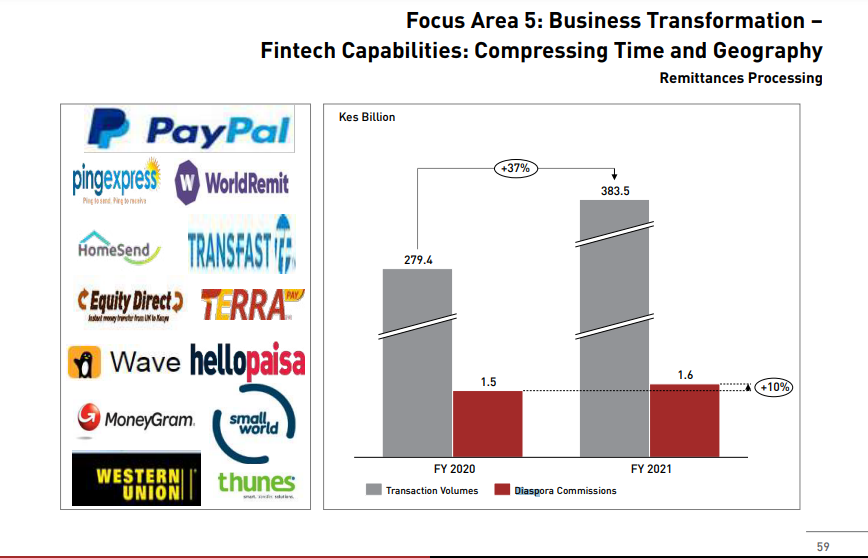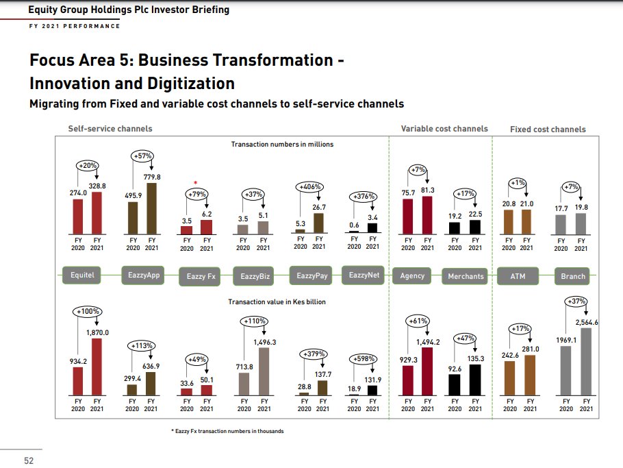 19. It is the leading Financial Institution in East Africa in Visa Acquiring business. Equity grew its acquiring business by double-digit to 53% YoY, which was attributed to the E-Commerce, as its processed volume tripled compared to 2020. equitygroupholdings.com