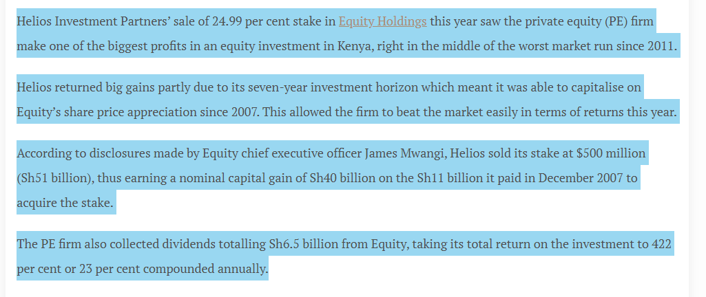 13. In 2007 Helios invested $185m (~KES 11b) in one of the best strategic investments ever made in a Kenyan company. The investment and its exit have become a case study of patient capital investments in funding rapid expansions rather than the use of leverage. @nderi_j
