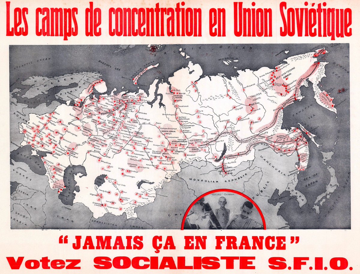 'The concentration camps in the Soviet Union' — French anti-Soviet poster from 1951 allegedly detailing the Soviet gulag system. The hammers and sickles indicate locally-administered camps, while the red dots indicate centrally-controlled camps.
