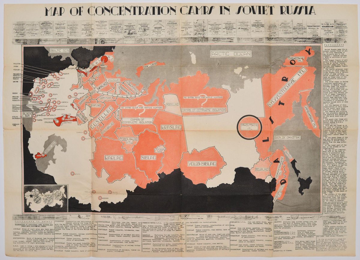 The first 'propaganda map' claiming to illustrate the Soviet gulag system appeared shortly after the war, in a 1945 publication authored by the Polish soldiers Sylvester Mora and Pierre Zwierniak. The map was circulated abroad and later reworked, most notably by Isaac Don Levine.