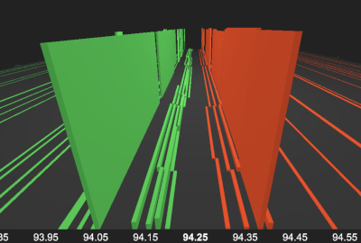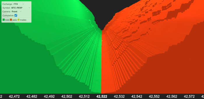 8/15: 2D is great, but WebGL lets us scale this concept into 3D. I've spent my weekend building an example crypto 3D order book. Behold, the valley of liquidity! You can check it out at 3dorderbook.com.