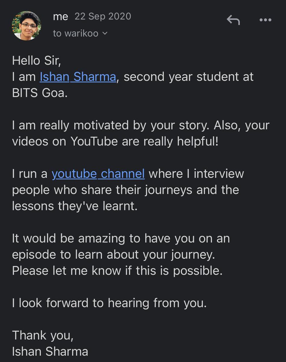 Here's the first cold email I sent to @VarunMayya after which I connected with him.