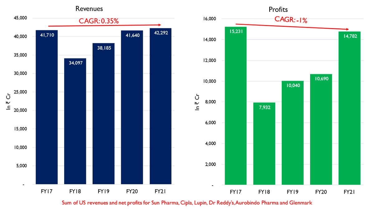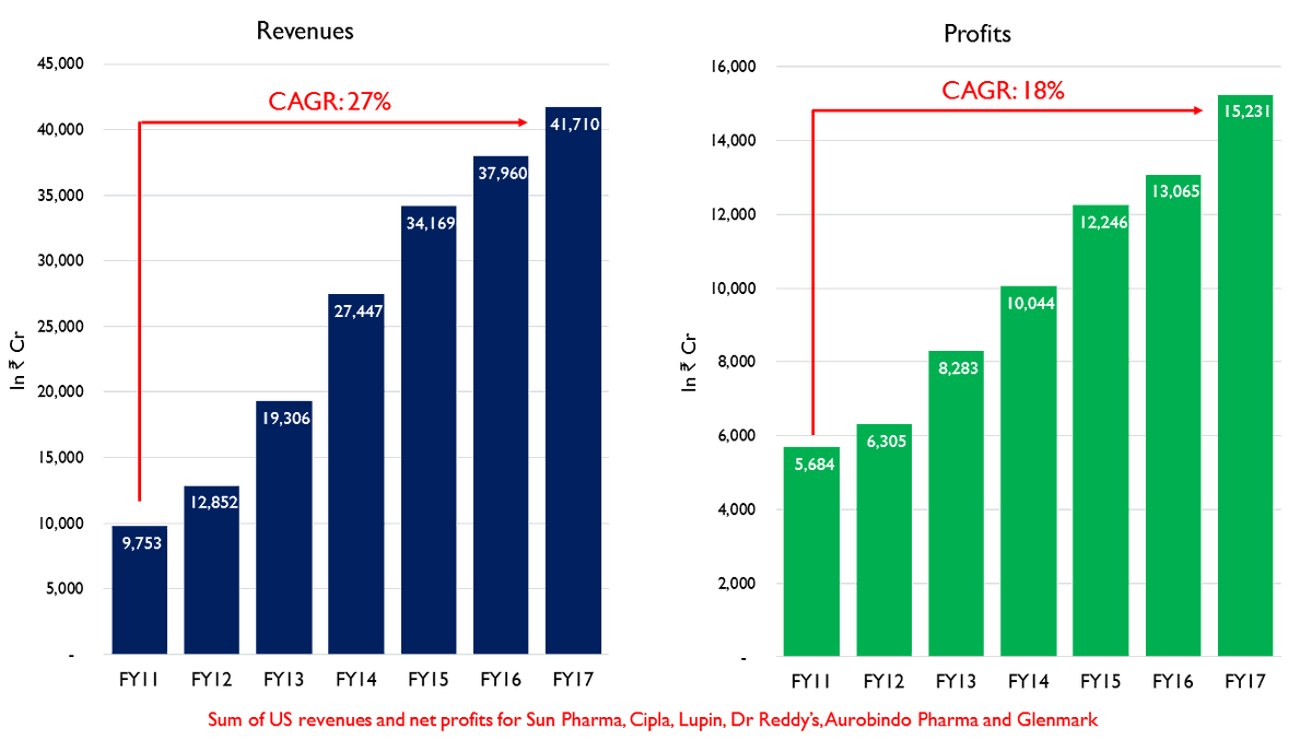 Due to a combination of these factors, Indian pharma companies saw a period of rising revenues and surging profits. Revenues of the top Indian pharma companies grew at a CAGR of 27% during this period and profits grew by a CAGR of 18%.
