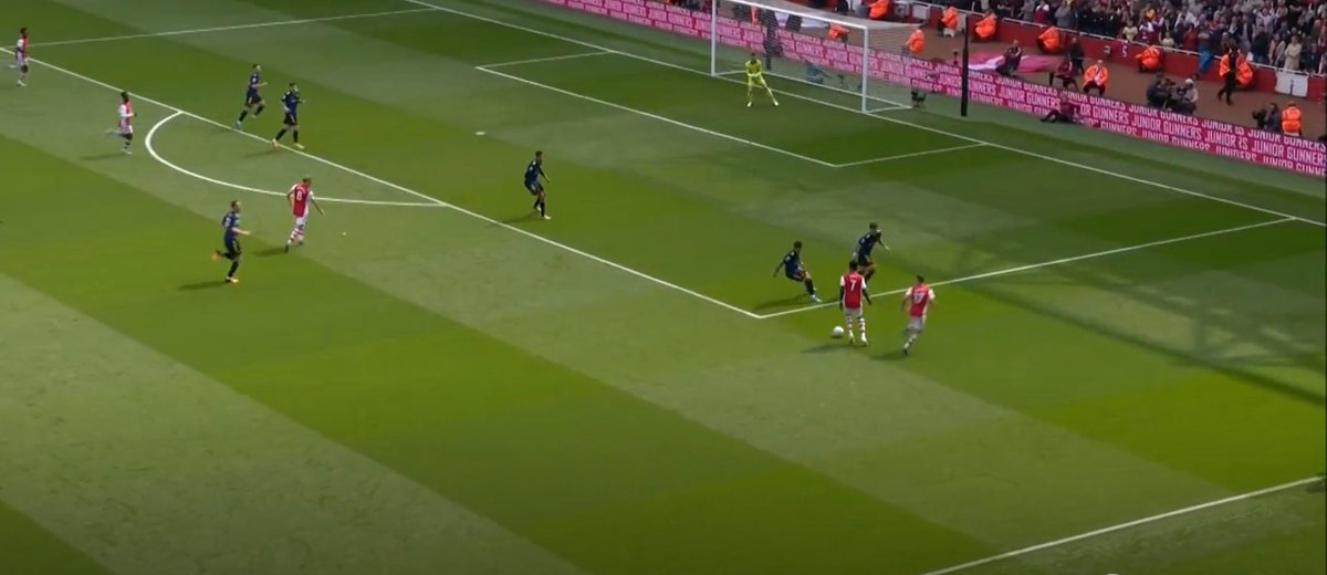 Crucially, the 4-3-3 dynamics remain. The width is held, there's presence between the lines, & there's compactness in midfield for defensive transitions, just like it is in the 4-3-3. ESR is closer to a #10 than a winger so Arteta adjusts the system accordingly with him inverting