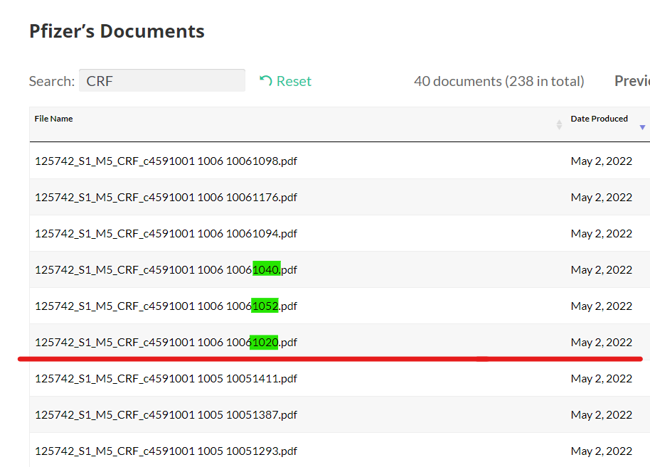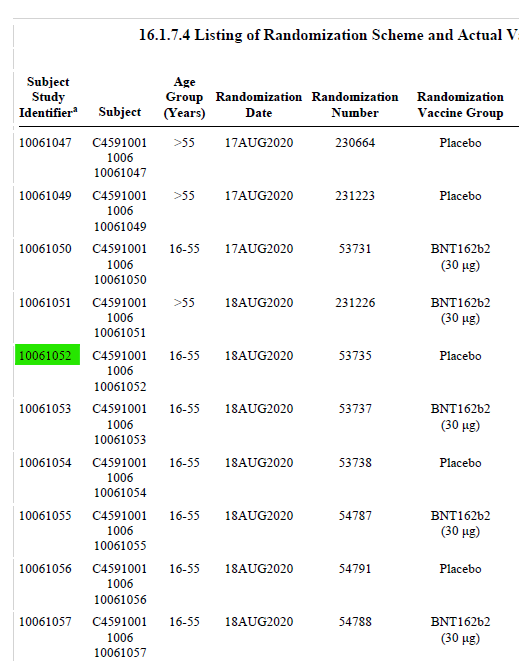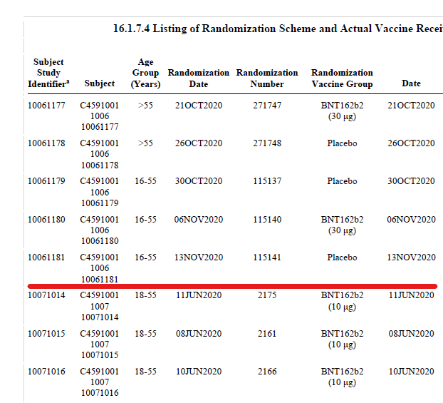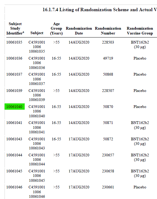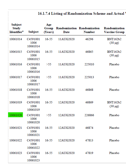 Another corroboration is the consecutive numbering. All patients at each site are consecutively numbered in the randomization log. So if a sample of CRFs were agreed between the FDA & Pfizer anything other than consecutively numbered CRFs would warrant investigation