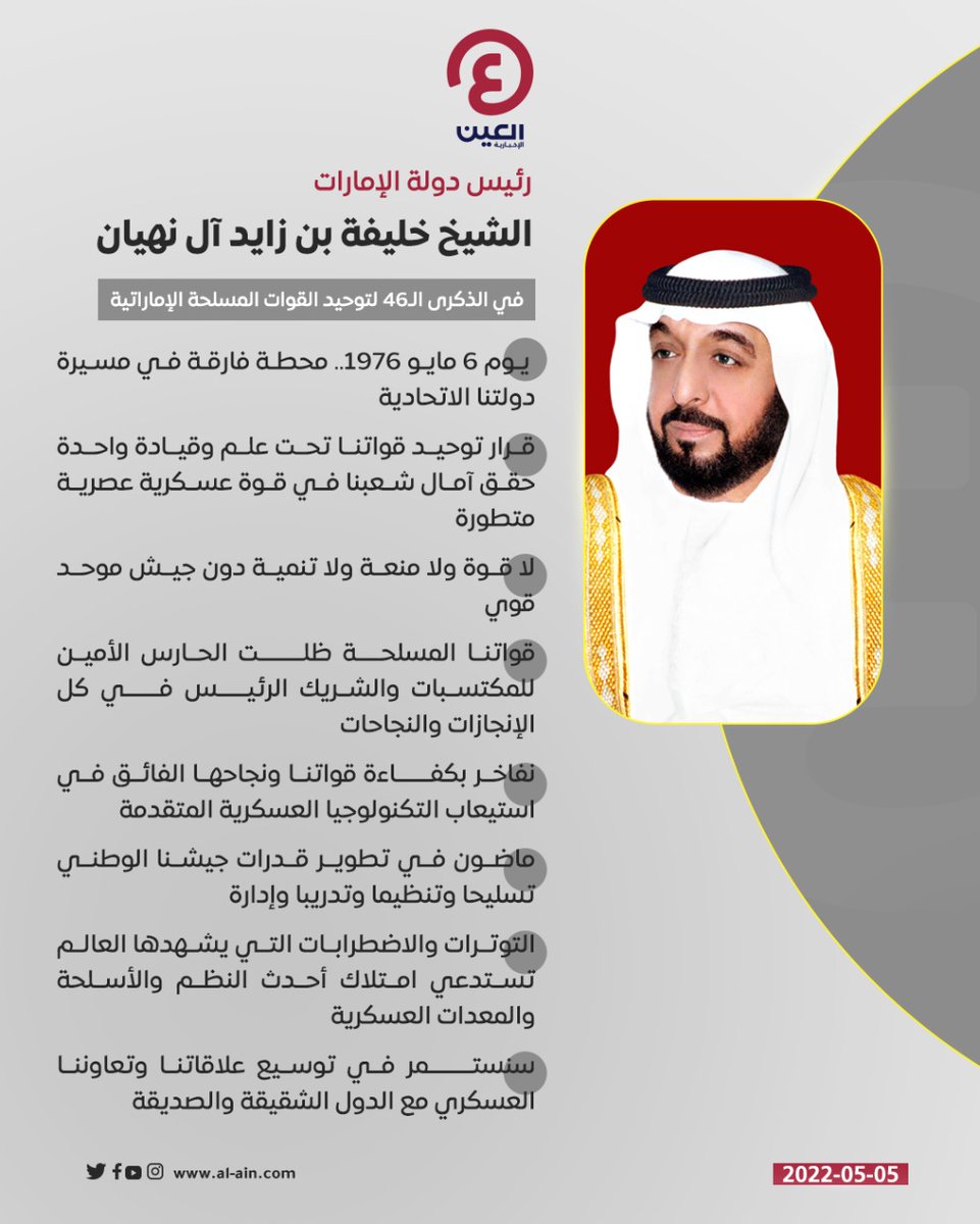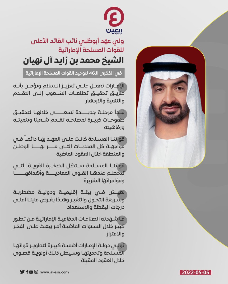 أبرز تصريحات رئيس دولة #الإمارات الشيخ #خليفة_بن_زايد آل نهيان، في الذكرى الـ46 لتوحيد القوات المسلحة الإماراتية