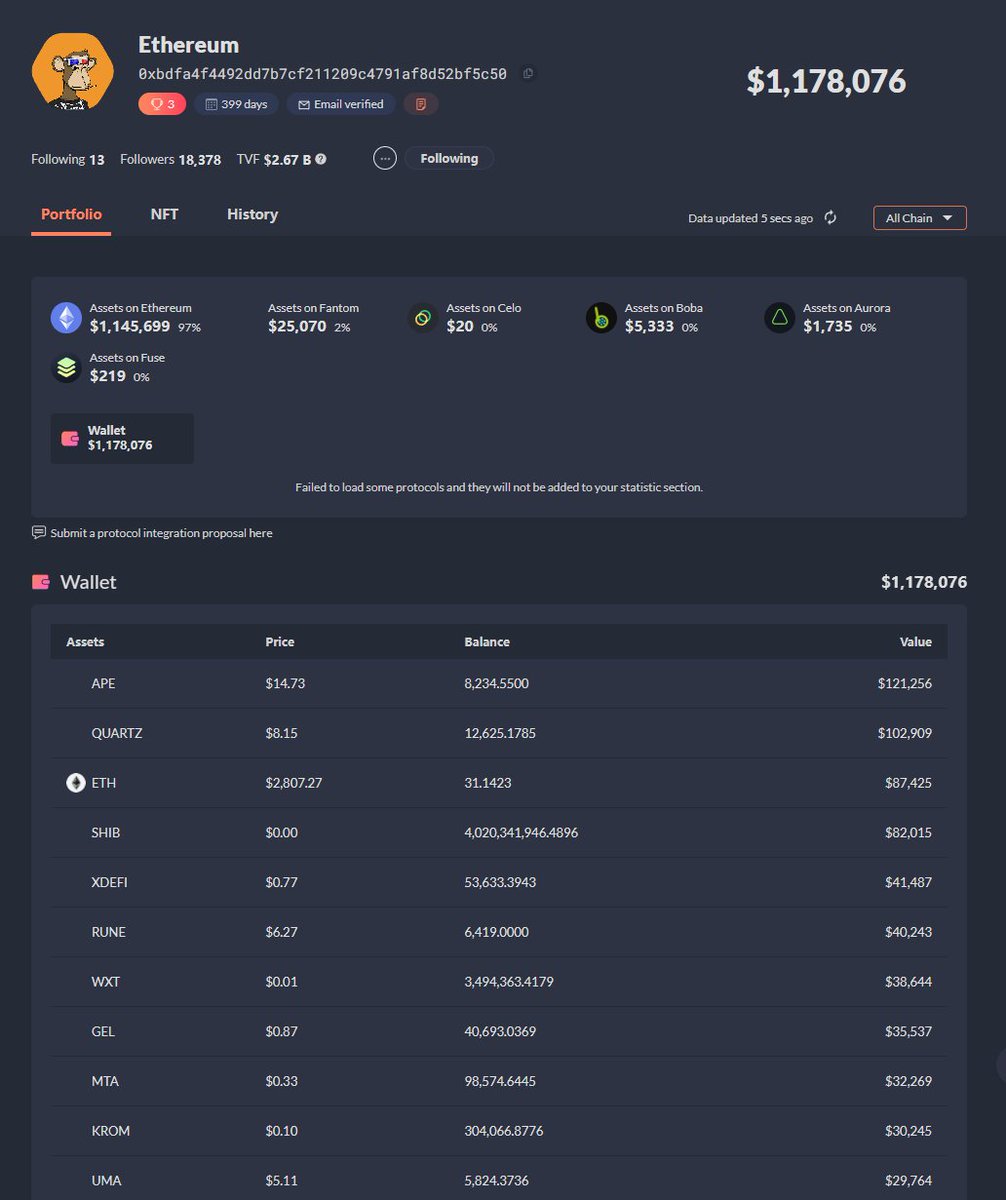 Explore your DeFi wallet and yield farming portfolio. You can also poke around other interesting wallets as well.