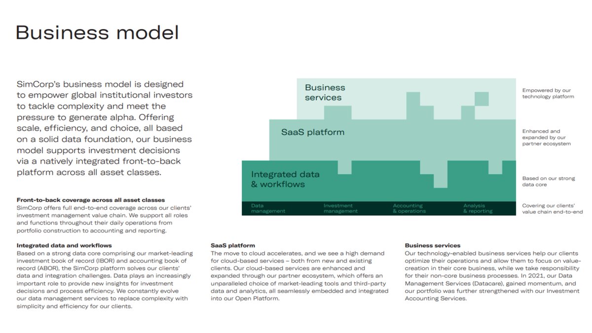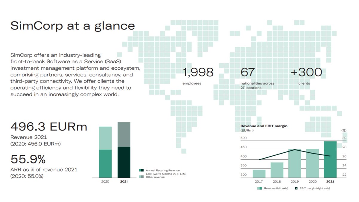LTM EBIT margin 27% SimCorp (est. 1971) has worked closely with investment and asset managers to become the worldβs leading provider of integrated investment management solutions for central banks as well as fund managers.