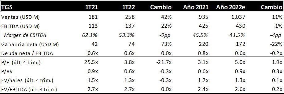 Ventas suben 10% en pesos ajustados año a año (42% en USD). Pero la nota menos positiva es que el EBITDA cae 5% (aunque sube 22% en USD), y el margen se achica 9 pp vs. 1Q21. Inciden el congelamiento de tarifas, y el mayor costo del gas para producir líquidos.