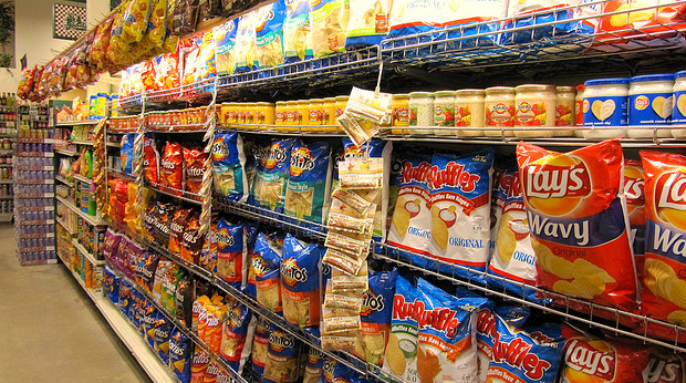 Bright vibrant boxes and packages litter the shelves.