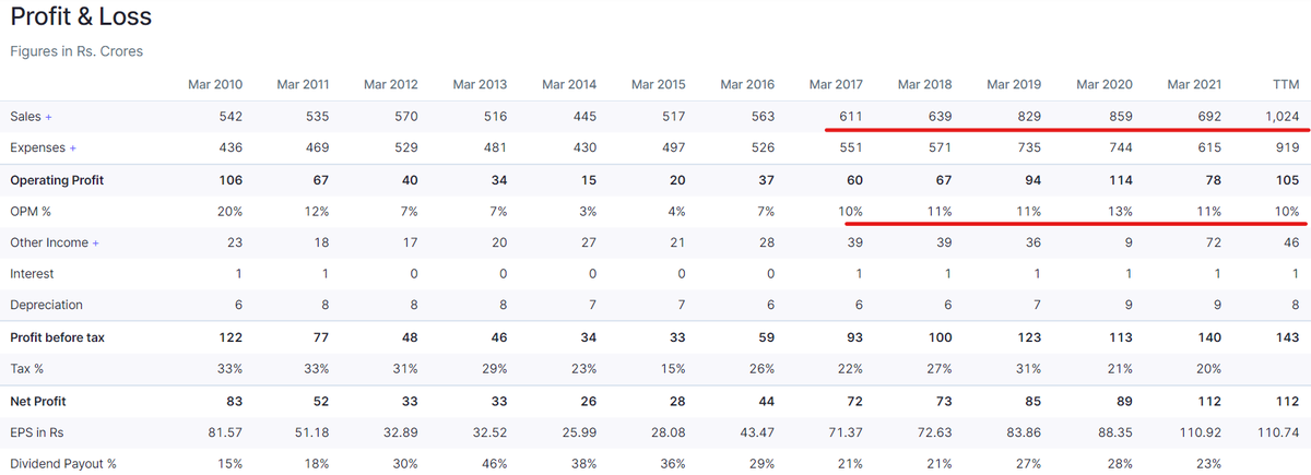 In the last up-cycle phase of FY03-09, it increased its EPS 21 times (from 5.3 to 114), with a 6-yr CAGR of 66%. Book value 11x.