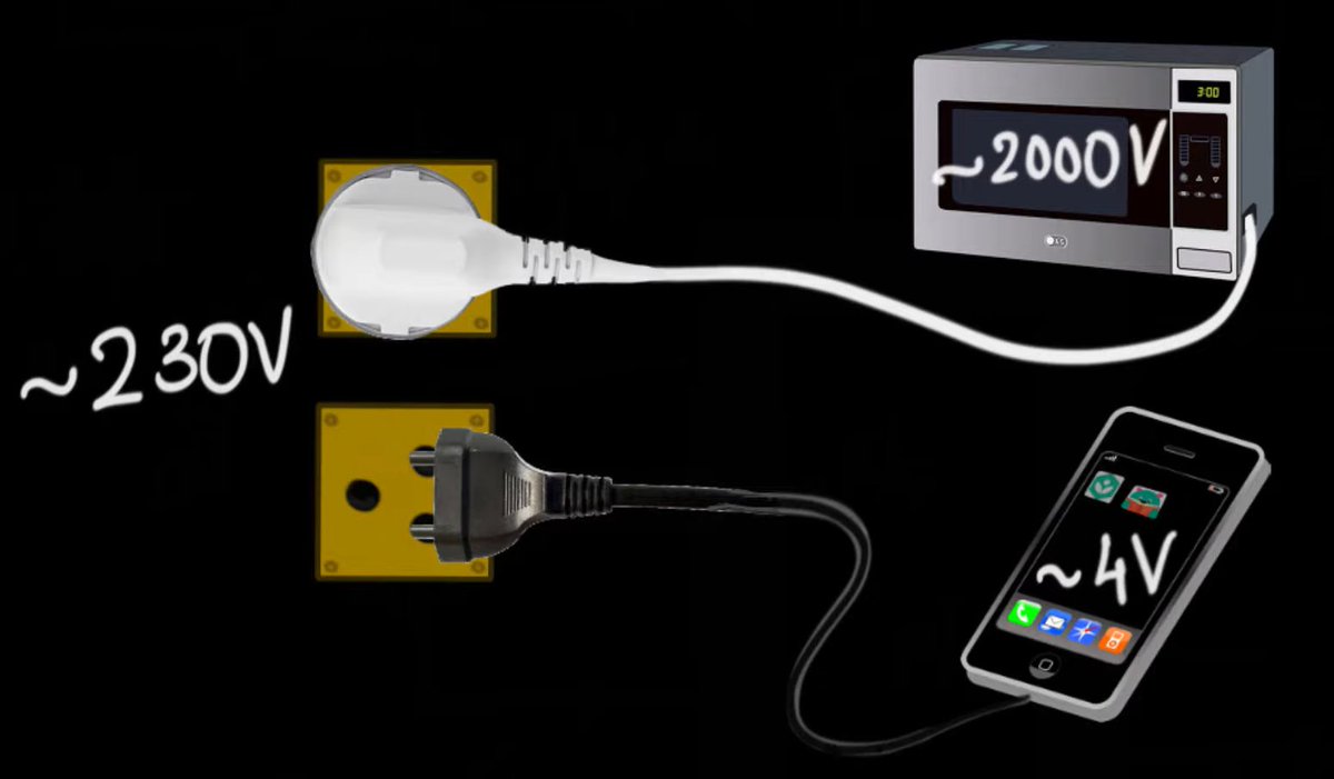 3/ Basically, it's transformers that allow you to charge your phone (which requires ~4V) & cook in a microwave (which requires ~2000V) from the same socket (which is ~230V)