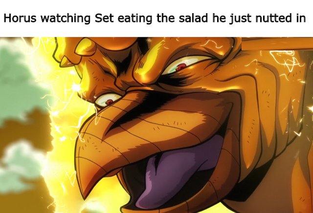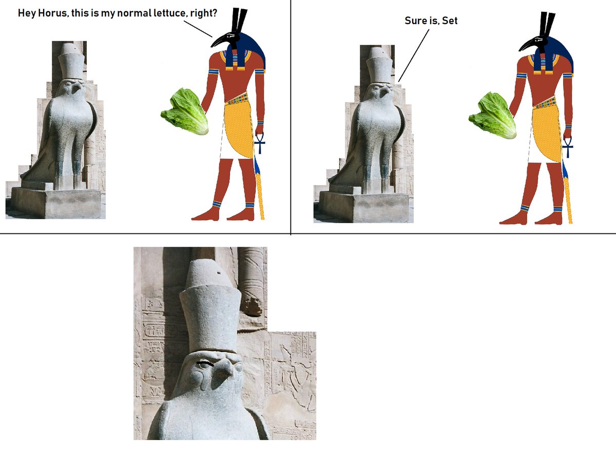 Horus tricks Set by basically spurting his sperm and throwing it into a lettuce plant, Set's Favorite Food! Isis feeds the lettuce to Set. Now because Set ate the semen-covered lettuce, in the eyes of the gods, Horus was seen as dominant.🤷 Allegorically Speaking, Of Course.