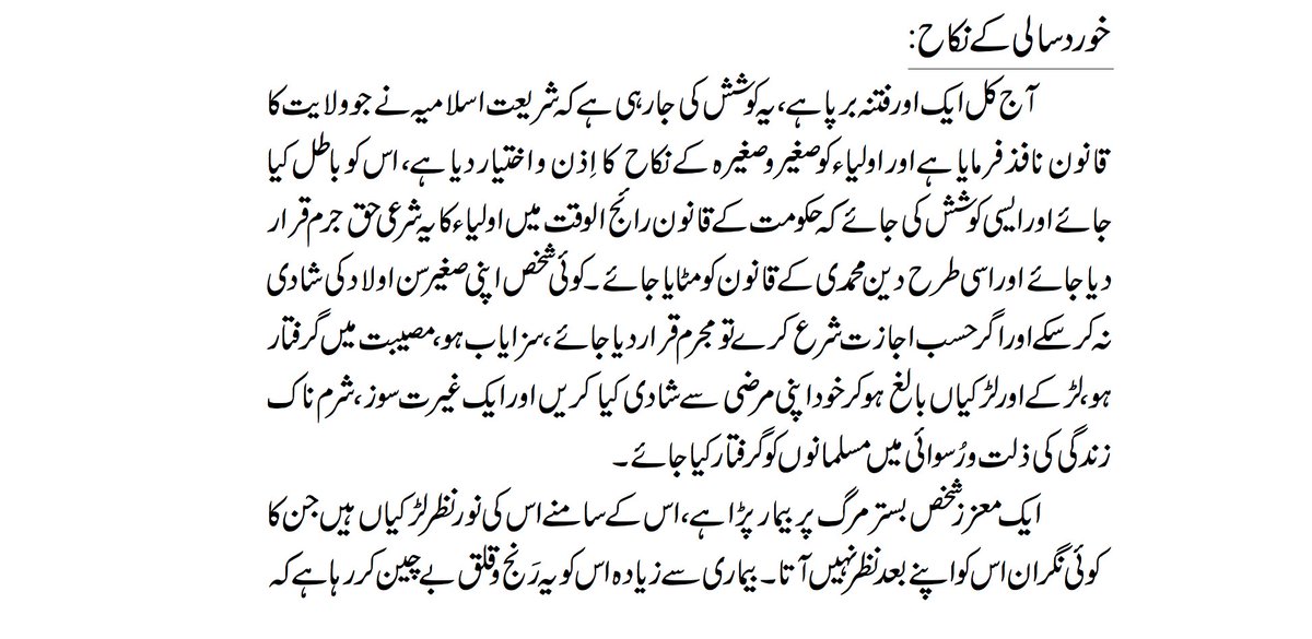 This was one example, if you pay heed then there are many benefits in marriages of minors, and by making it a crime the life, wealth, and honour of Muslims all fall into danger, and worse than all of these what a calamity is this, that the law of the pure Sharīáh is abolished.
