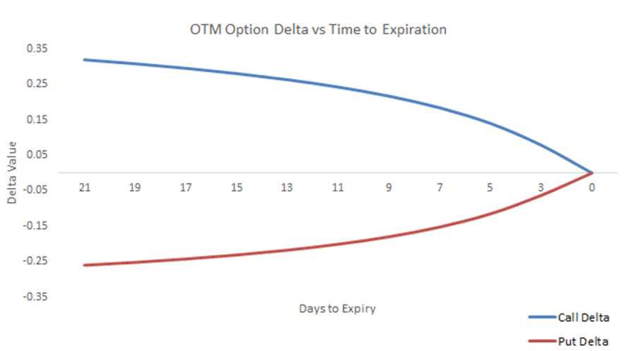 As opções fora do dinheiro têm um delta, em módulo, cada vez menor.