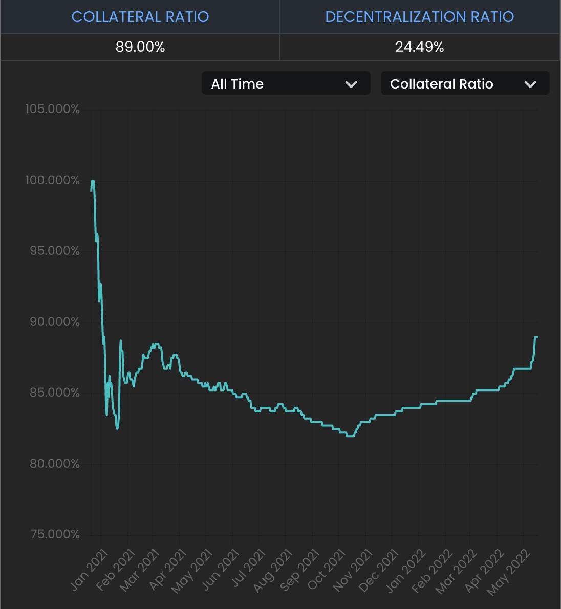• Frax is backed by collateral + FXS. The ratio is 89% now.