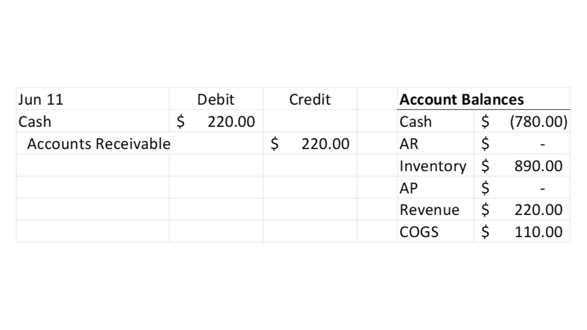 Accrual: revenue is recorded for $220 (11 units x $20/unit) and expense for $110 (11 x $10/unit cost)