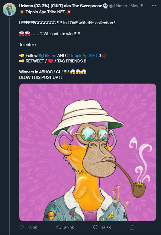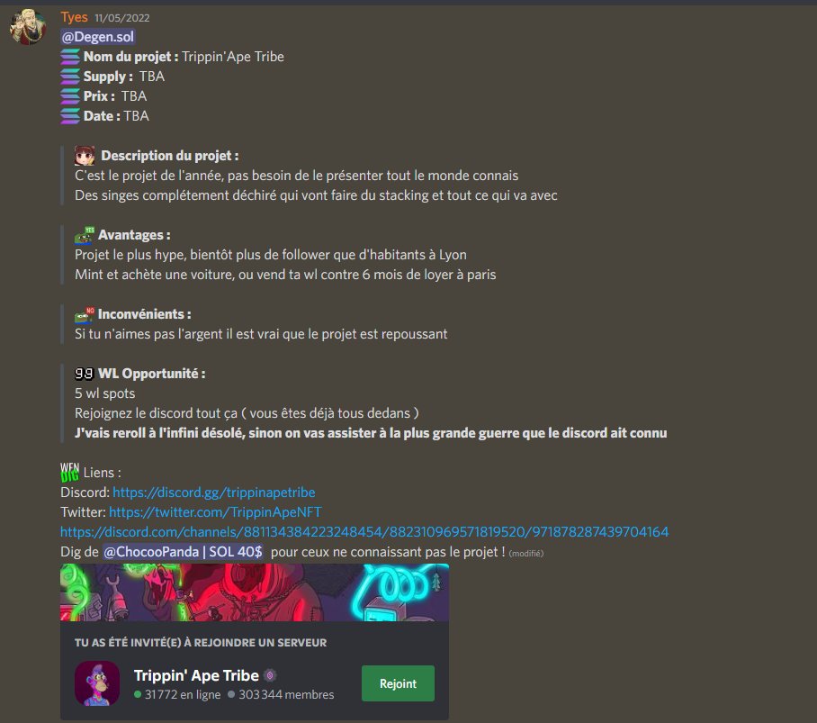 Ex:@TrippinApeNFT qui est le projet le + hype du moment
