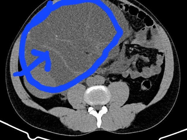 Yg diduga tumor tsb adalah kedua ginjal yg membesar. Yg satunya karena penyempitan saluran kencing (ureter). Yg sebelah karen ada batu ginjal banyak. Akhirnya stlh diperbaiki kondisinya karena pasien infeksi dan Hb kurang; sy lakukan operasi.