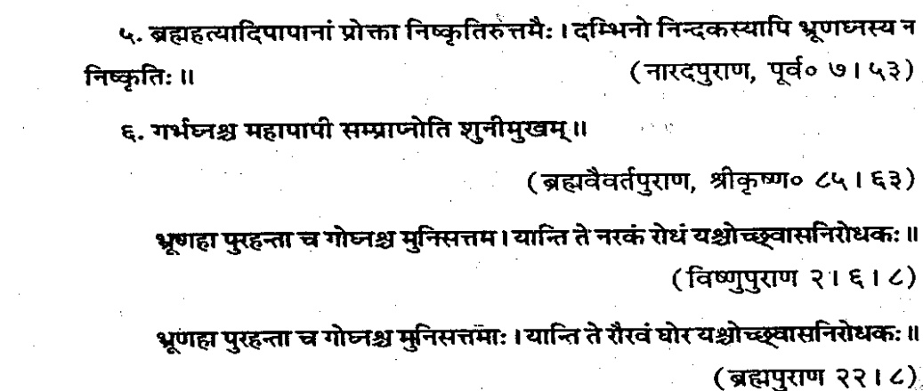 ५. श्रेष्ठ पुरुषों ने ब्रह्महत्या आदि पापों का प्रायश्चित बताया है, पाखण्डी और परनिन्दक का भी उद्धार होता है किन्तु जो गर्भ के बालक की हत्या करता है, उसके उद्धार का कोई उपाय नहीं है। ६. भ्रूणहत्या करनेवाले रोध (श्वासोच्छ्वासको रोकनेवाला), शुनीमुख, रौरव आदि नरकों में जाते हैं।