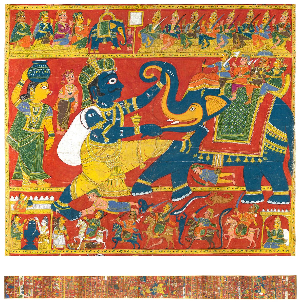 This huge painted scroll of the Madel Puranamu illustrating the story of the Daksha-Yajna & Virabhadra, is from Chariyal in Telangana, and is signed by the artist Nakashi Venkata Ramaiah (active first half of the 20th century), one of the last great Cheriyal scroll painters. 2/