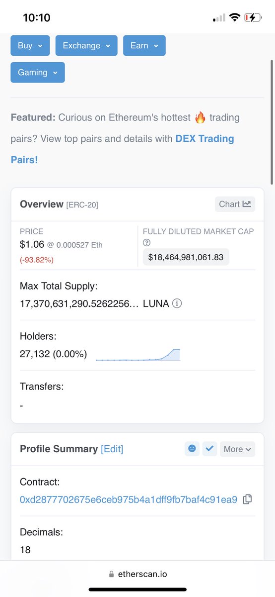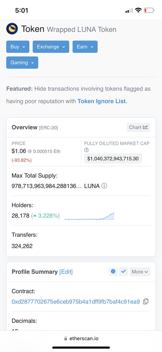 While @terra_money was flooded with billions of $Luna and priced at 7¢ the $ETH wrapped Luna $wLuna had a supply of a few dozen million and was selling on @CoinbaseExch at 50¢ for hours. Who was abusing this 600% premium? CB wallet in question: etherscan.io (3/13)