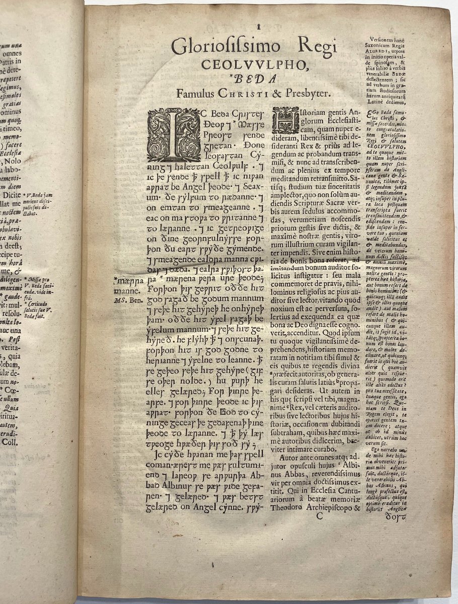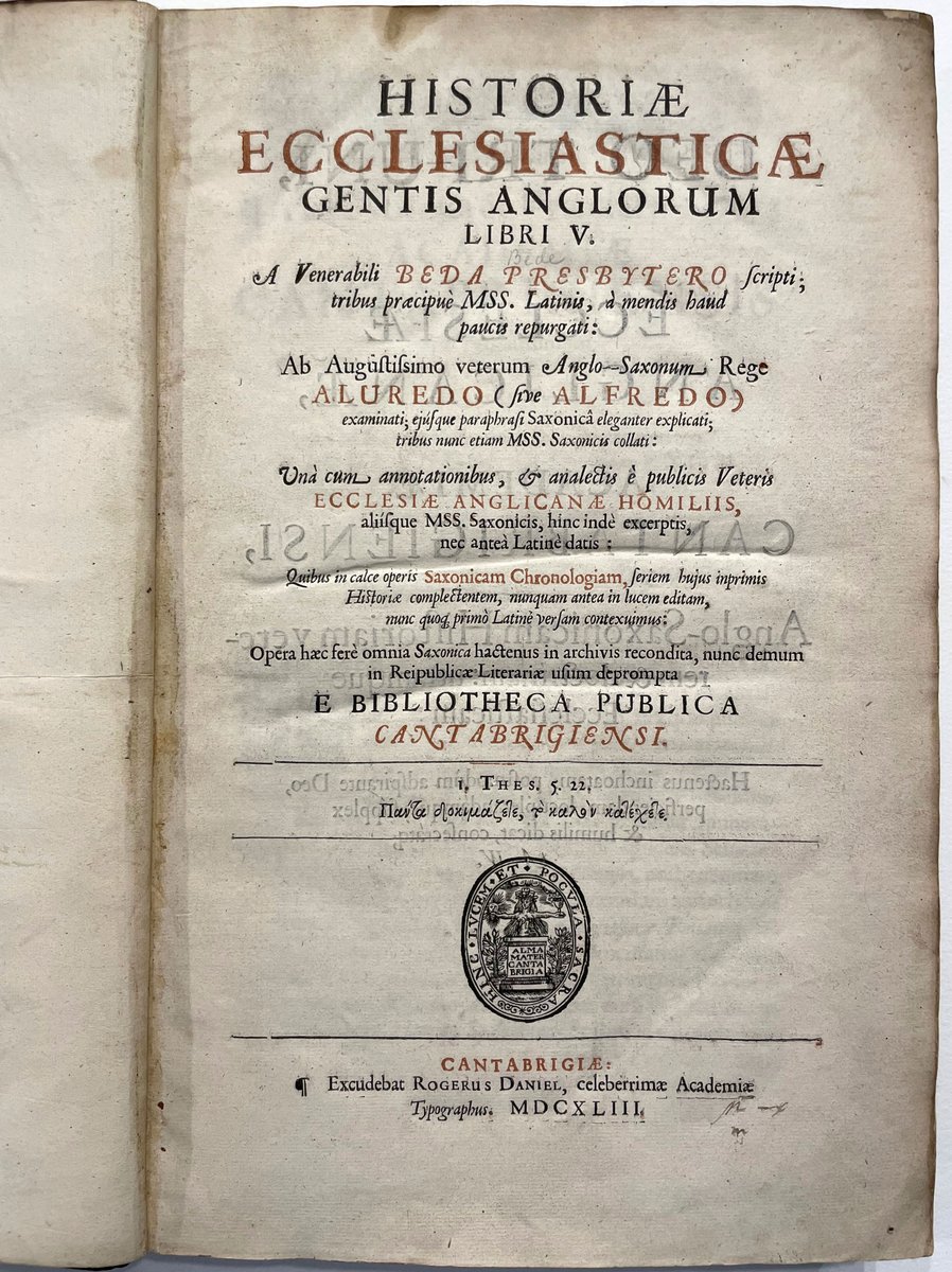 This is Bede's "Historiae ecclesiasticae gentis Anglorum" printed in Cambridge in 1643 - the first printing of the work in England and the first printing of the 9th century Old English translation traditionally ascribed to Alfred the Great. 1/