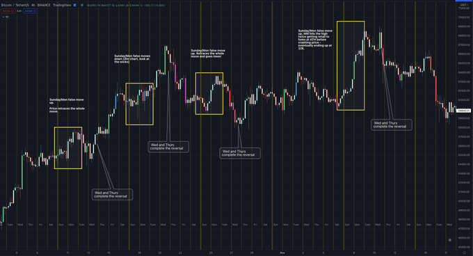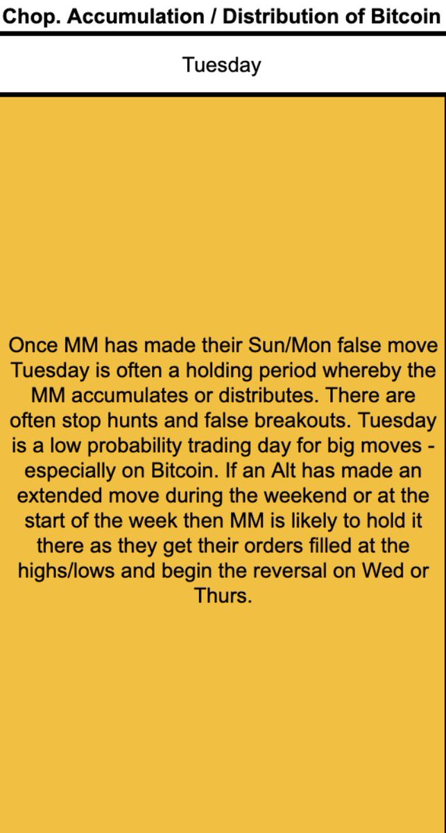 15/ After they've made their moves on Sun/Mon more often than not Tuesday is a holding day. (This isn't always the case - the drop from 48k to 28k was started on a Tuesday after Saylor announced a purchase - which is usually a trigger to go short