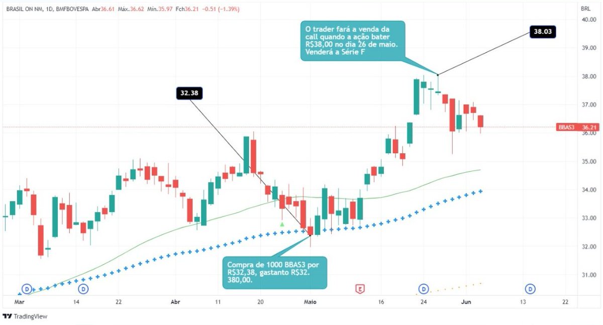 Lembre-se que o trader 2 efetuou a venda de call quando BBAS3 estava cotado em R$38,00.