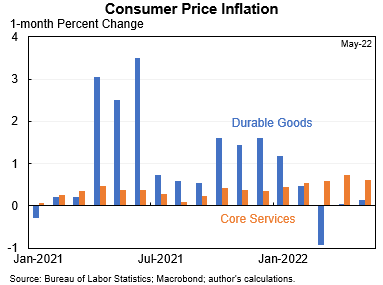 Here is another way to see the handoff from goods to services by month. The worry about this, again, is that the hopeful story for this yr was the rotation would lower inflation. So far it has not. I still think it will a little when special factors go away. But just a little.
