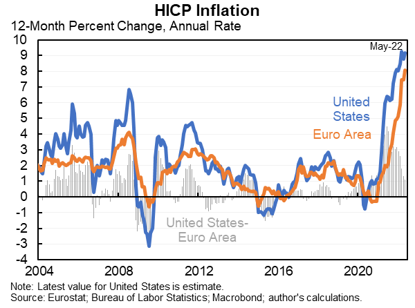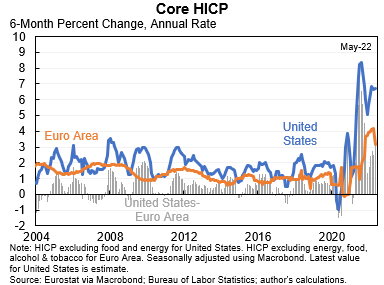 With this unexpectedly high number headline U.S. inflation is now running about 1pp above Euro area inflation and core is running about 2.5pp above it over the last year.