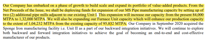 The company is expanding their product portfolio and adding more "value-added products" like - Rust Free MS Pipes, End Facing of MS Pipes, Packaging.