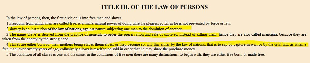In the “Institutiones”, Book I, Title III (Of the Law of Persons), slavery is defined as an “institution of the law nations”, though it is “against nature subjecting one man to the dominion of another” (#link2H_4_0004" target="_blank" rel="noopener" onclick="event.stopPropagation()">gutenberg.org).