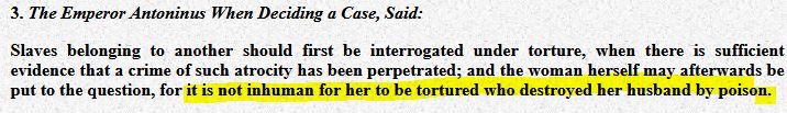 Torture of slaves was also allowed in specific cases, such as adultery, fraud, and treason. This is stated in the “Codex Justinianus”, Book IX, Title 41 (droitromain.univ-grenoble-alpes.fr).