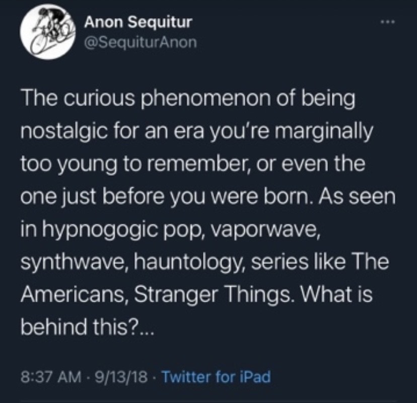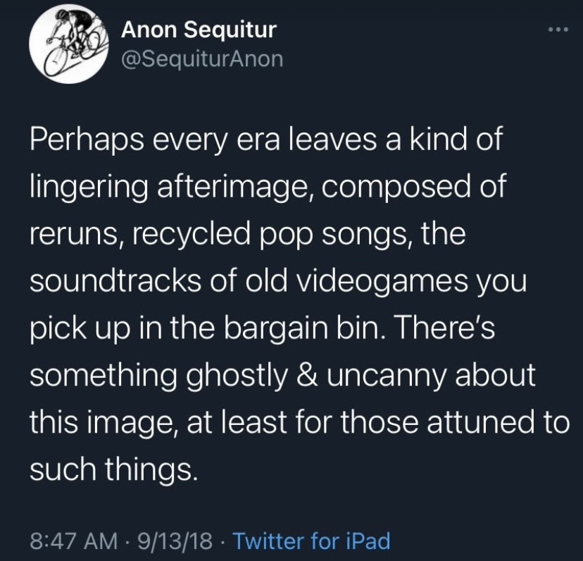 Always looking backward or forward, neither here nor there, this generation is stuck in place, trapped in limbo, caged in a digital present being borne back ceaselessy into the past.
