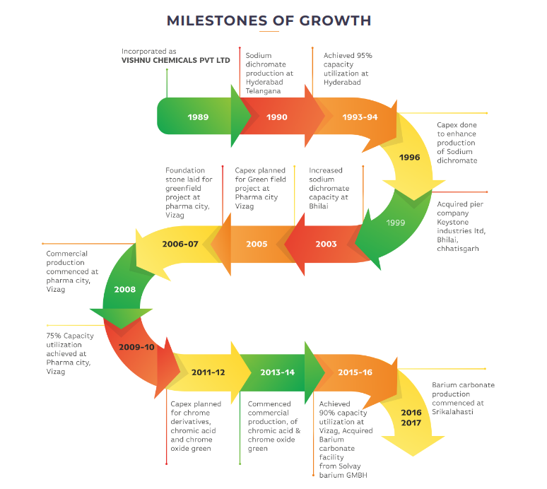 Incorporated in 1989, Vishnu Chemicals Limited is in the business of manufacturing, marketing, and exporting Chromium chemicals and Barium compounds worldwide. The company is serving more than 12 industries across 60+ countries globally.