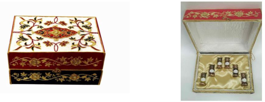 PM gifted Itr bottles in a zardozi box from Lucknow, UP to France President Emmanuel Macron The Zari Zardozi box has been hand embroidered on khadi silk & satin tissue in colours of the French National Flag. The motifs are traditional Indo-Persian, lotus flowers hand embroidered