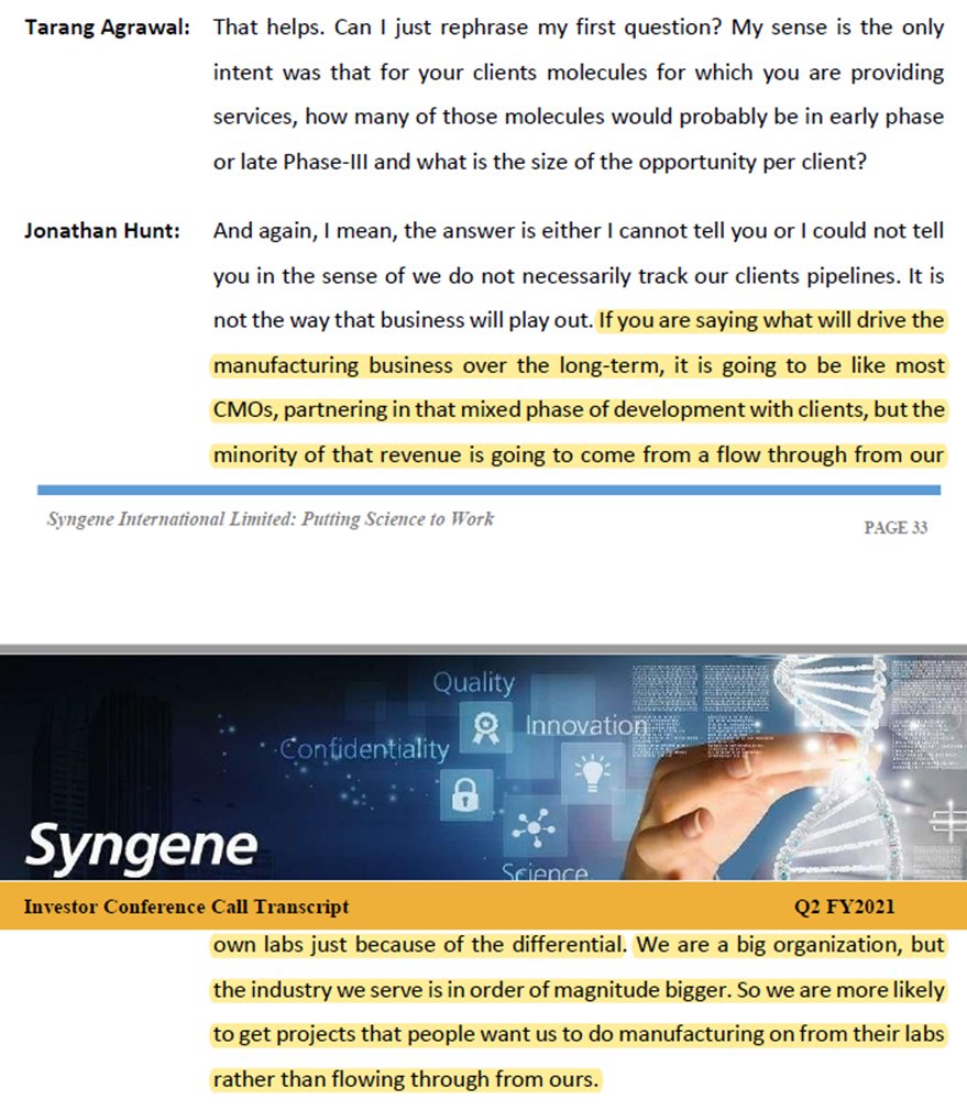 One would expect that given a large CRO with multiple projects, Syngene would have a ready pipeline of projects to feed into its manufacturing business.