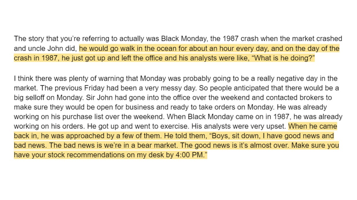 1/ My favorite parts from the recent Lauren Templeton interview from @TIP_Network, about John Templeton's life, habits, routines, and investing philosophy ππΌπ