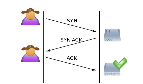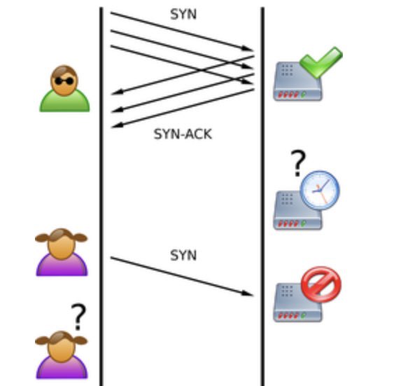 ( SYN-ACk ) بعدين يرسل clinet موافقة ( ACK) بعدها يقدرو يرسلو البيانات هنا يجي ل attacks يستغل رسالة الطلب فيرسل SYN لسيرفر لما يرد عليه ب SYN-ACk ) يروح يرسل SYN اخرى لكن بايبي ادرس مختلف وزي كذا في كل مره يرسل طلب محادثة لكن باييي مختلف لين يمتلىء السيرفر بالجلسات المفتوحة اللي