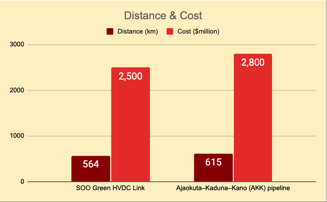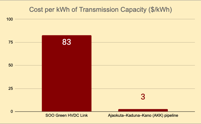 And building power lines to transmit the same amount of energy from the Niger Delta in place of the gas pipeline would cost;