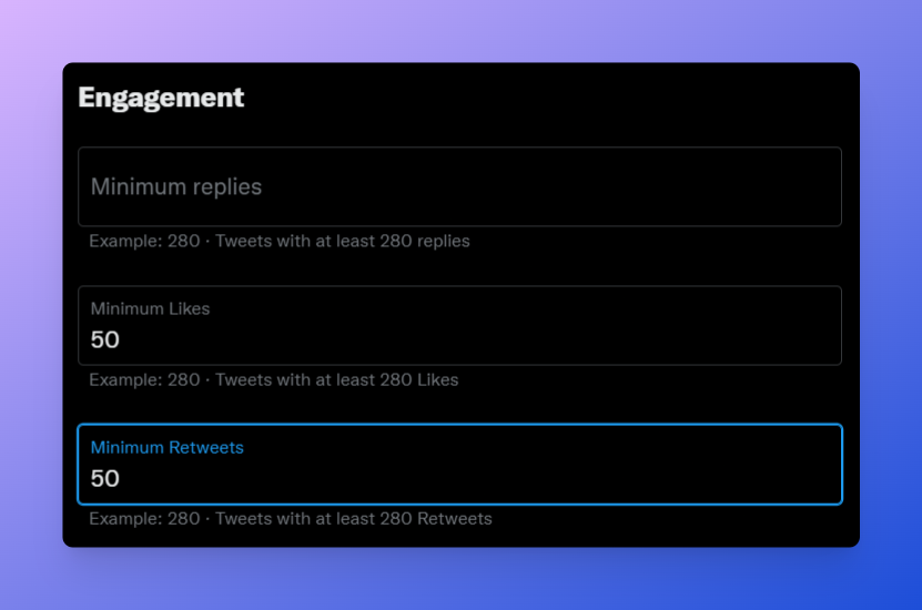 • Engagement: Filter Tweets by engagement (replies/likes/retweets)