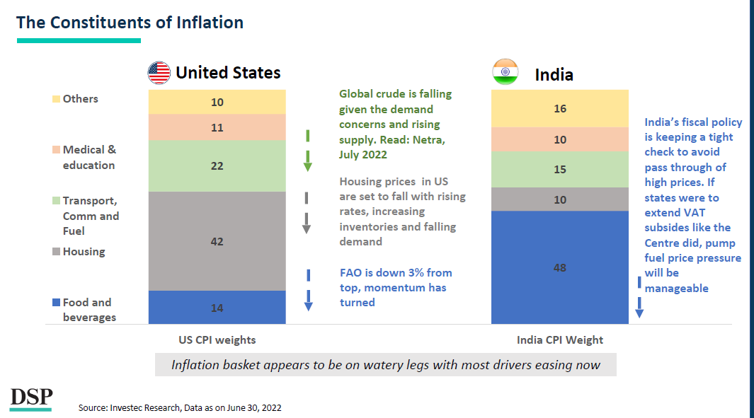 1. Biggest driver of inflation – commodity prices – are falling. US Housing, the core inflationary component is red hot. This is likely to cool off and mean revert.