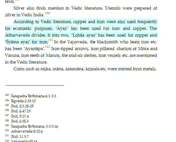 Acc. to Vedic literature, copper and iron were also used frequently for economic purposes. ‘Ayas’ has been used for iron and copper