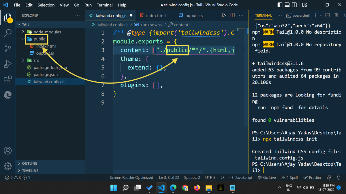 โ The "public" folder has 2 files that are "index.html" and "output.css"