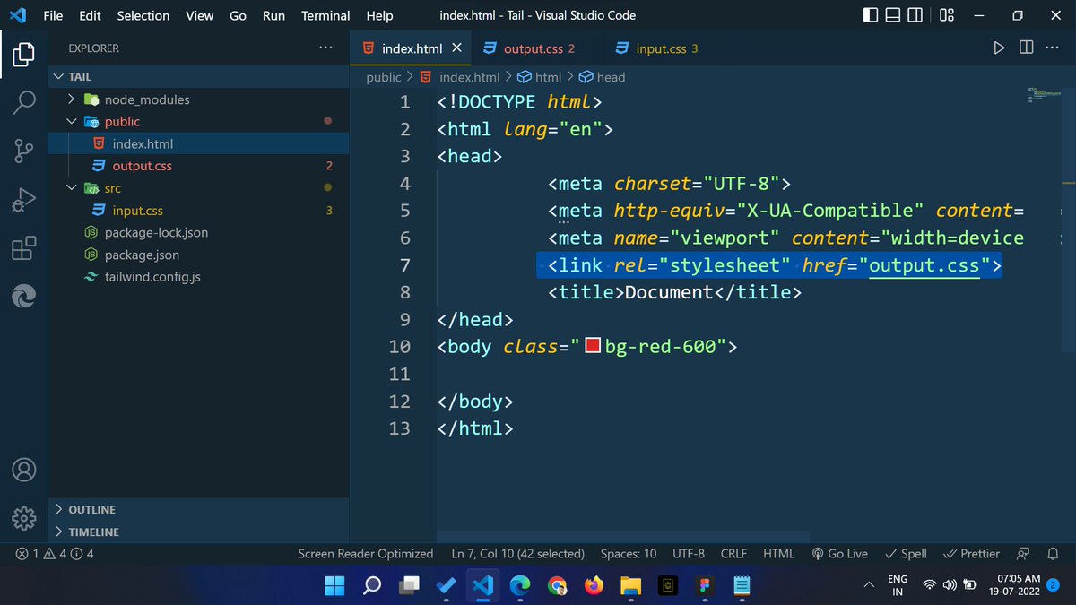 8๏ธโฃ Finally, we have to run "npx tailwindcss -i ./src/input.css -o ./public/output.css --watch" command into the terminal.