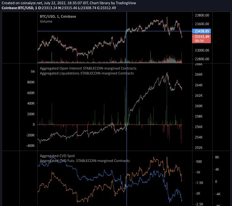 Observe the horny longs from 23k; this is normal as price goes up, until spot diverges. The blue CVD is spot and currently selling into perps. If this continues, the perps will get absorbed, price will reverse against them, and the dominoes fall (ty @smolcomfy for chart)